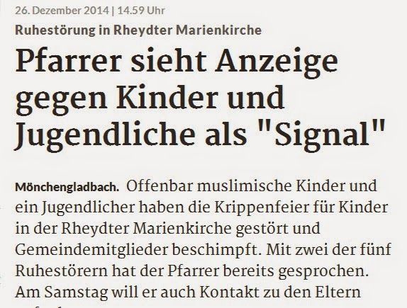 Σύμφωνα με μια αγγλική μετάφραση της είδησης που δημοσιεύτηκε την Παρασκευή στη γερμανόφωνη RP Online, μια ομάδα παιδιών μουσουλμάνων, συμπεριλαμβανομένου ενός εφήβου, διατάραξε μια χριστουγεννιάτικη λειτουργία στην καθολική εκκλησία της Αγίας Μαρίας στην πόληMönchengladbach-Rheydt. Σύμφωνα με την είδηση, οι μουσουλμάνοι διέκοψαν την λειτουργία φωνάζοντας αντι-χριστιανικές βλαστήμιες. Μια αναζήτηση στο Google, ωστόσο, διαπίστωσε ότι εκτός από διάφορα «συντηρητικά»blogs, η είδηση αγνοήθηκε πλήρως από τα λεγόμενα «mainstreamμέσα ενημέρωσης».