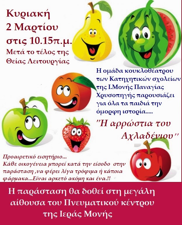 Την Κυριακή 2 Μαρτίου στις 10.15π.μ. μετά το πέρας της Θείας Λειτουργίας η ομάδα του κουκλοθέατρου των Κατηχητικών σχολείων της Ιεράς Μονής Παναγίας Χρυσοπηγής στη μεγάλη αίθουσα του Πνευματικού κέντρου της Μονής θα παρουσιάσει για όλα τα παιδιά και τους γονείς τους τη θεατρική παράσταση κουκλοθέατρου