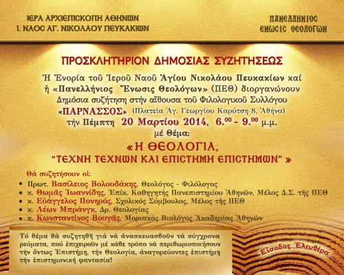 Ἡ Ἐνορία τοῦ Ἱεροῦ Ναοῦ Ἁγίου Νικολάου Πευκακίων καί ἡ «Πανελλήνιος Ἕνωσις Θεολόγων» (ΠΕΘ) διοργανώνουν Δημόσια συζήτηση στήν αἴθουσα τοῦ Φιλολογικοῦ Συλλόγου «ΠΑΡΝΑΣΣΟΣ» (Πλατεία Ἁγ. Γεωργίου Καρύτση 8, Ἀθήνα)