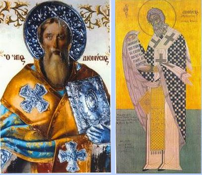 Στο σημείο αυτό θα πρέπει να τονιστεί ότι ο τιμώμενος στις 9 Οκτωβρίου Άγιος Διονύσιος των Παρισίων, ο οποίος είναι ο απόστολος των Γάλλων και ο πρώτος επίσκοπος των Παρισίων, στάλθηκε στη Γαλλία από τον επίσκοπο της Ρώμης Φαβιανό για να κηρύξει τον χριστιανισμό μαζί με τους δύο μαθητές του, τον Ελευθέριο και τον Ρουστικό. Το 250 μ.Χ. έγινε ο πρώτος επίσκοπος της πόλεως των Παρισίων και εκεί μαρτύρησε δι’ αποκεφαλισμού μαζί με τους δύο συνεργάτες του το 272 ή το 280 μ.Χ. κατά τον διωγμό του Ουαλεριανού ή του Δεκίου. Το λείψανό του ετάφη στον λόφο της Μονμάρτης ή σύμφωνα με άλλη παράδοση στο χωριό Κατουλίακο, το οποίο βρίσκεται κοντά στο Παρίσι και σήμερα φέρει το όνομα Άγιος Διονύσιος (St. Denis). Εκεί το 626 μ.Χ. κτίσθηκε η περίφημη Μονή του Αγίου Διονυσίου, όπου και εναποτέθηκαν τα λείψανά του.