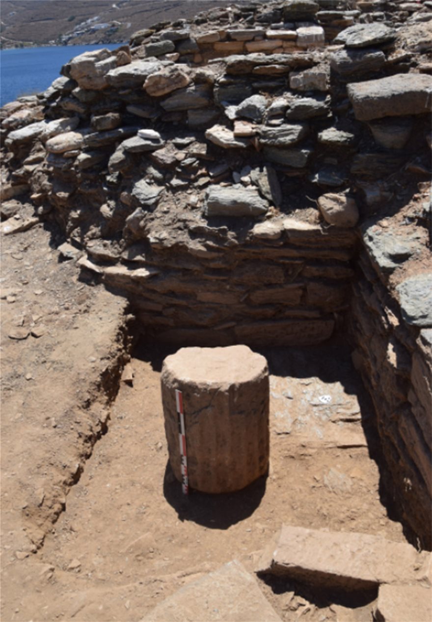 Τέλος κατά την ανασκαφή εξωτερικά και περιμετρικά της τρίκλιτης πρωτοβυζαντινής βασιλικής αποκαλύφθηκε όρθια τοποθετημένος, ένας μαρμάρινος σφόνδυλος κίονα ιωνικού ρυθμού και άλλα μαρμάρινα μέλη, όπως τα θραύσματα τραπεζοφόρου με απόληξη λεοντοπόδαρου, που αποτοιχίστηκαν και μεταφέρθηκαν στην αρχαιολογική συλλογή της Χώρας για λόγους ασφαλείας.