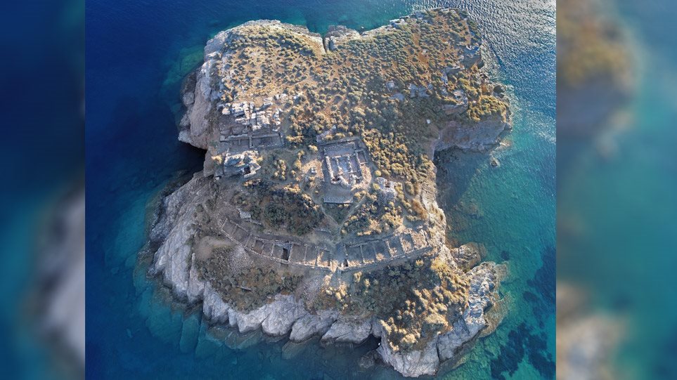 Το κτηριακό συγκρότημα των Πρωτοβυζαντινών χρόνων συγκροτείται από έναν περίβολο με οχυρωματικό χαρακτήρα συνολικού μήκους 76 μέτρων με το τείχος (μέσου πλάτους 1,20-1,50 μέτρων) που φράσσει την μοναδική πρόσβαση στην νησίδα προς την μεριά του αρχαίου λιμανιού. Στο εσωτερική του πλευρά αναπτύσσονται 15 ορθογώνια δωμάτια σε παράταξη και με είσοδο το καθένα προς το εσωτερικό της βραχονησίδας.