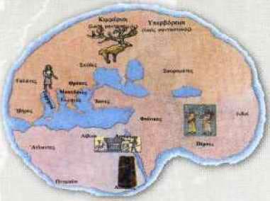 Αλλά καθώς η θάλασσα ανέβαινε ολοένα και ψηλότερα, ευχήθηκαν στους θεούς του τόπου κι’; όταν σώθηκαν σε ανάμνηση του γεγονότος ύψωσαν πέτρινα σύνορα γύρω-γύρω απ’ το νησί κι’ έκτισαν βωμούς.