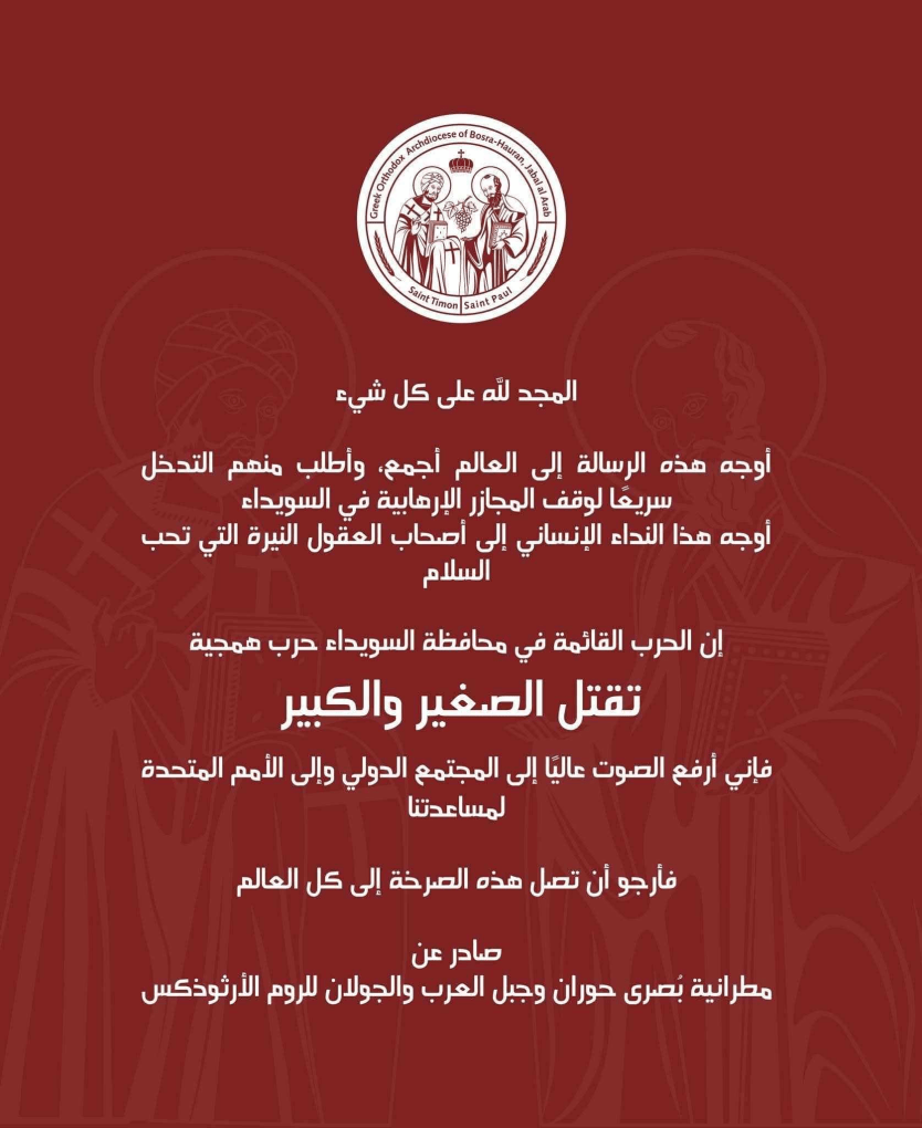 Δόξα τω Θεώ πάντων ένεκεν. Απευθύνω αυτό το μήνυμα σε ολόκληρο τον κόσμο, ζητώντας τους να επέμβουν γρήγορα για να σταματήσουν οι τρομοκρατικές σφαγές στη Σουέιντα. Απευθύνω αυτήν την ανθρωπιστική έκκληση στον φωτισμένο και ειρηνικό λαό. Ο συνεχιζόμενος πόλεμος στο Κυβερνείο Σουέιντα είναι βάρβαρος, σκοτώνει νέους και ηλικιωμένους. Υψώνω δυνατά τη φωνή μου στη διεθνή κοινότητα και τα Ηνωμένα Έθνη να μας βοηθήσουν. Ελπίζω αυτή η κραυγή να φτάσει σε ολόκληρο τον κόσμο.